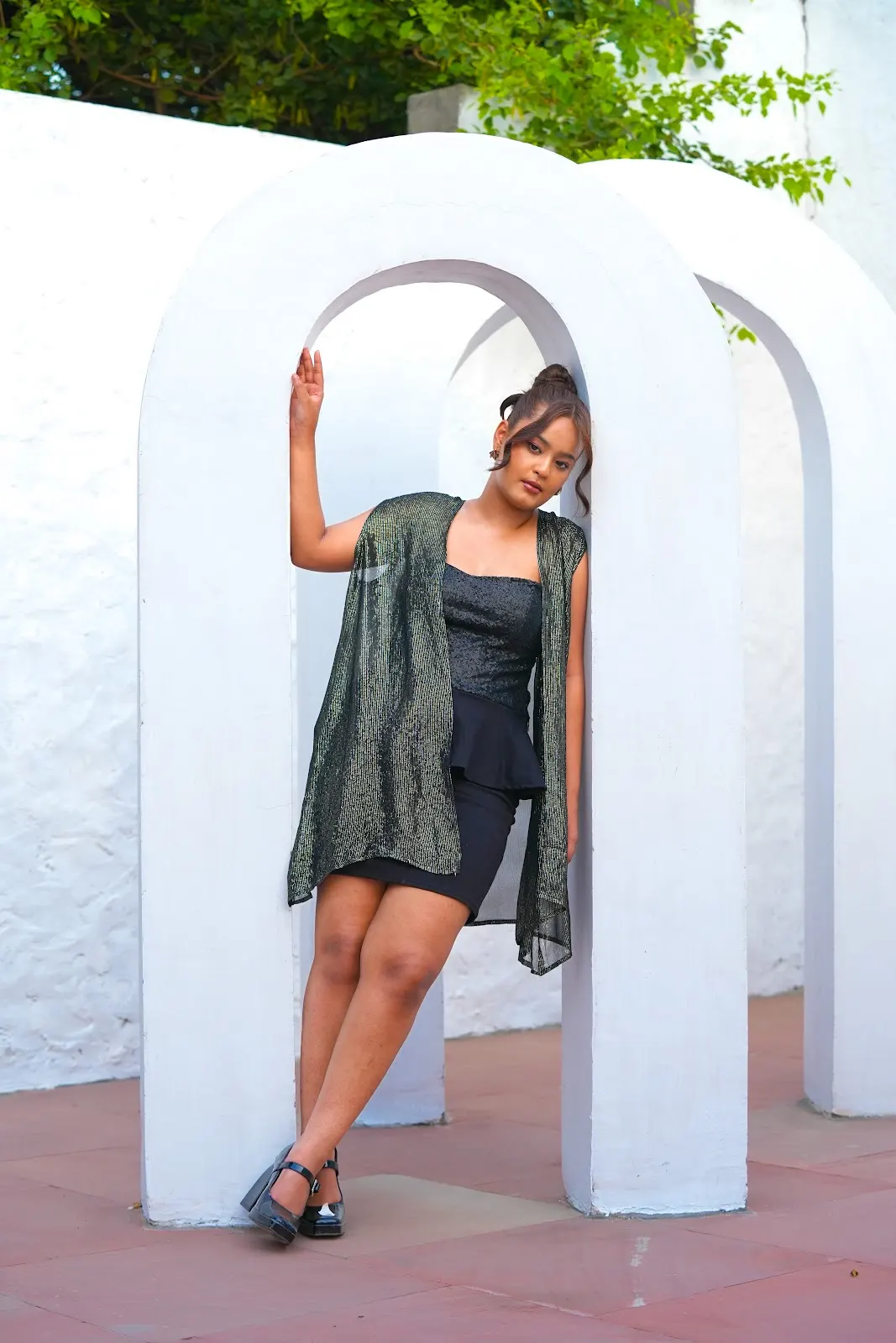 Make an entrance in this stunning cardigan, kissed with golden shimmer that catches every flicker of light. Airy and elegant, it floats with every step—perfect for turning heads at soirées, celebrations, or any moment you want to feel unforgettable.